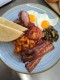 Fasole carnaciori, crispy bacon, oua, ciuperci, paine